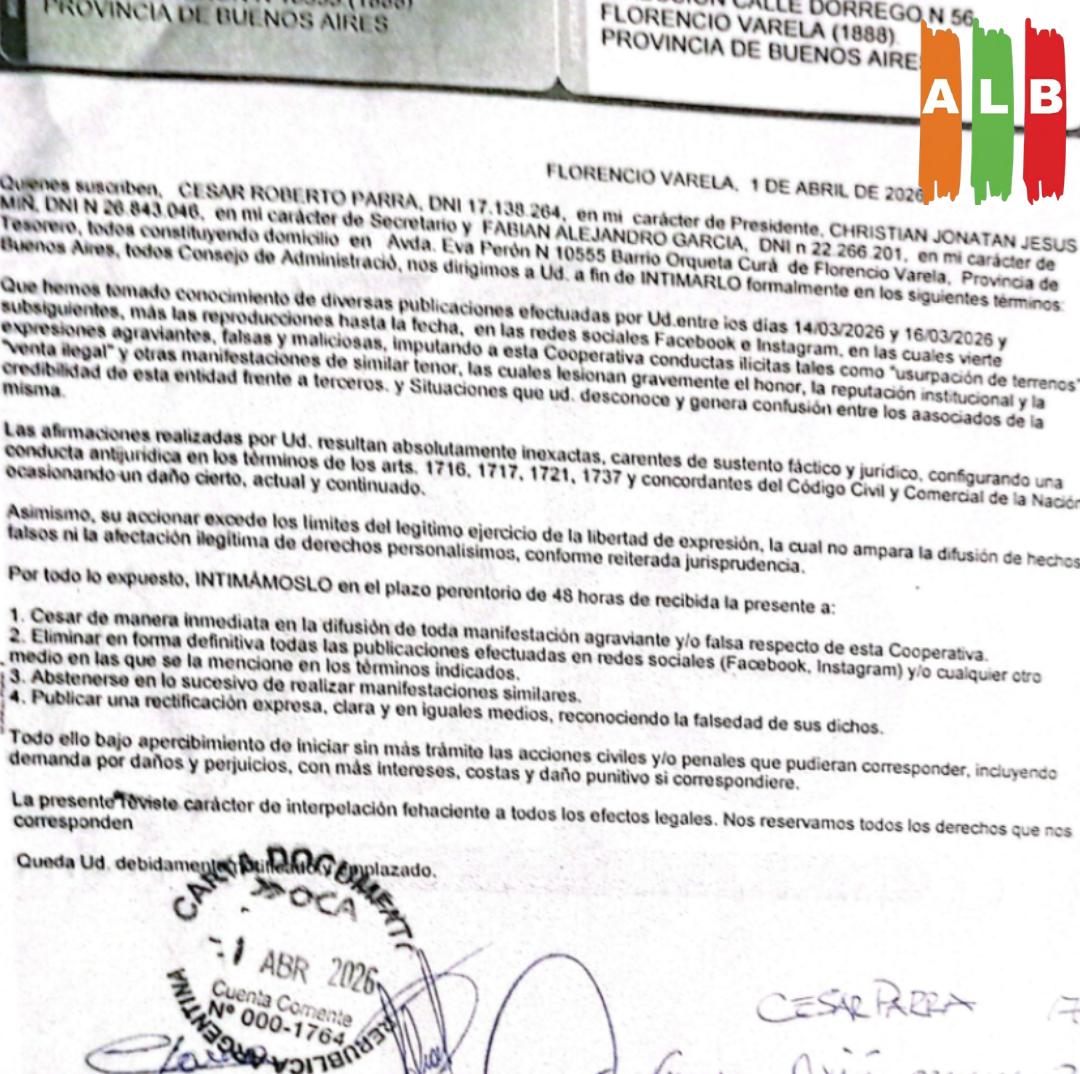 RESPUESTA A LA CARTA DOCUMENTO DE LA COOPERATIVA ORQUETA CURA DE FLORENCIO VARELA