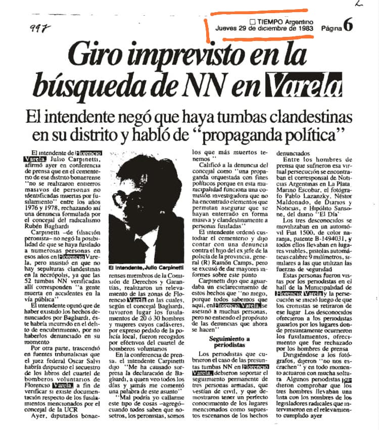Aun así, siguieron adelante valientemente y la primera denuncia sobre cuerpos NN enterrados en el Cementerio Municipal de Florencio Varela durante la dictadura la realiza el ex bombero voluntario y Concejal de la UCR Oscar Bagliani acompañado por Jorge Fava. Denuncia descalificada por el intendente de la época Julio Carpinetti y las familias del orden conservador local varelense.