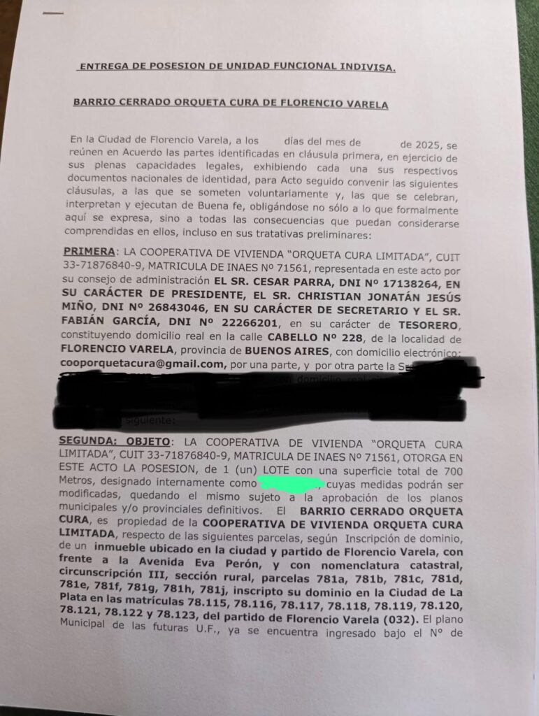 El loteo ilegal pasó a manos de conocidos varelenses que componen la Cooperativa de Viviendas Orqueta Cura Limitada que dice haber comprado la propiedad el 27 de junio del 2025.