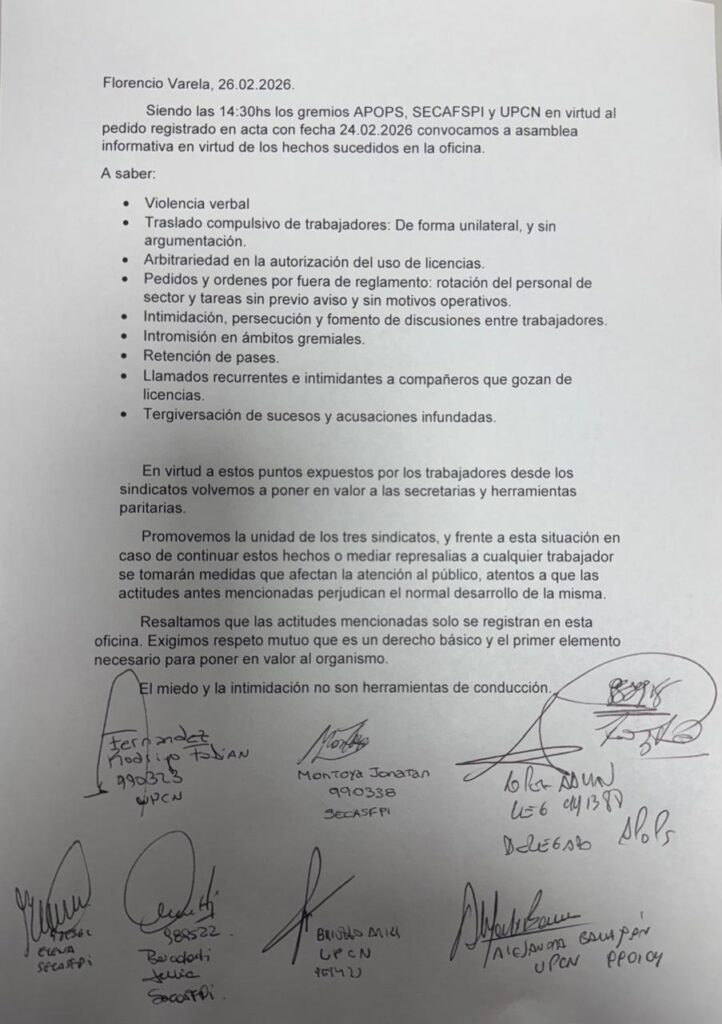 El accionar de Da Silva, que no tiene ninguna cualidad más que ser la pareja de Bondarenko, logró un hecho inédito, y es que los tres gremios, junto a todos los trabajadores, se reúnan en una única asamblea y exijan el fin de la violencia verbal, los traslados injustificados, las licencias arbitrarias y las intimidaciones.