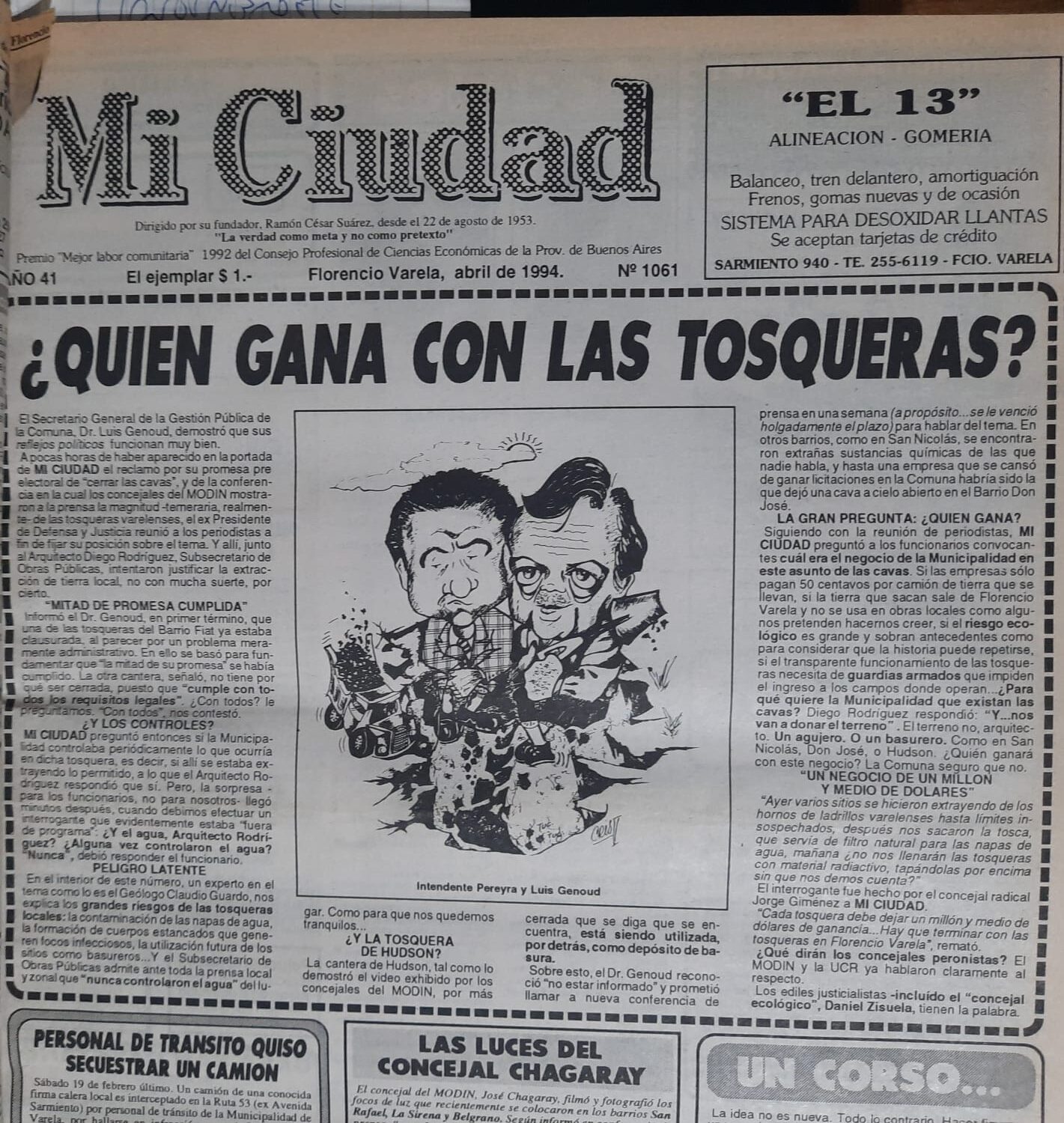 Gracias al archivo del diario “Mi Ciudad” en su número 1061 del mes de abril de 1994, podemos ver una conferencia de prensa que muestra al «ciudadano ilustre” Luis Genoud como un personaje clave en los negocios de las tosqueras ilegales.